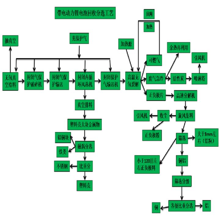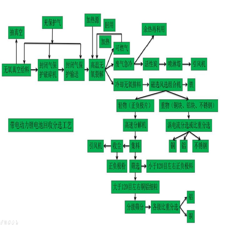 帶電鋰電池經閉氧給料進入貧氧破碎,在進入送至循環風選,比重分選與磁渦分選把鐵、鋁塊、銅塊、不銹鋼和塑殼分出,選出極片,隔膜,塑膠類等進無氧裂解爐,裂解系統注惰性氣再加熱使爐內保持無氧狀態,鋰電池正負極極片電解液在爐內放電發熱,同時裂解的可燃氣與分選廢氣進行燃燒,對爐進行加熱,從而達到了電池電能裂解可燃氣,分選廢氣,電解液的綜合熱值利用,裂解后的正負極片進入摩擦脫粉系統,脫粉后在經氣流分選、收塵、篩選、比重分選,把極片分為正負極粉、銅粒、鋁粒。裂解燃燒后的廢氣處理(冷卻、收塵、噴淋、氣霧分離、吸附過濾、煙囪排放等)達標排放。經過一系列的工序把鋰電池分為鐵、鋁塊、銅塊、不銹鋼、塑殼、正負極粉、銅粒、鋁粒。