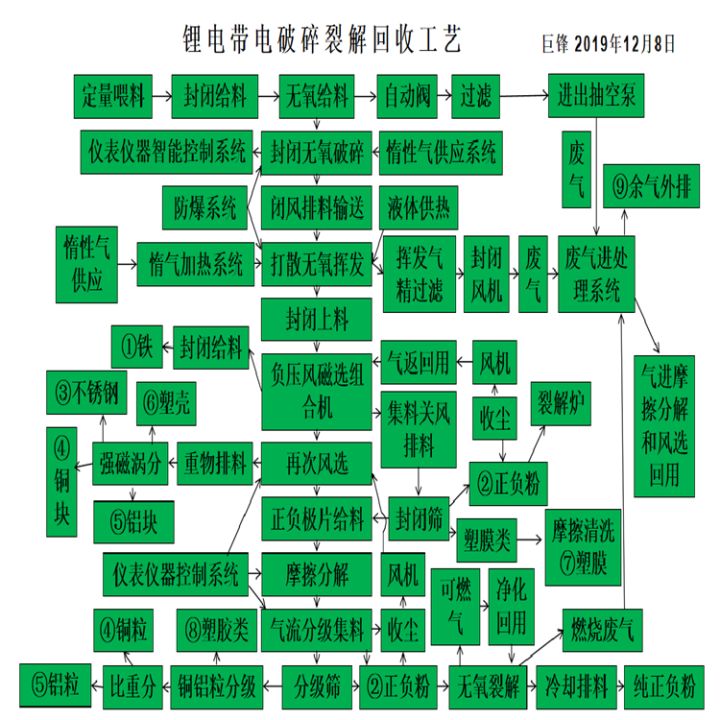 帶電鋰電池經無氧給料進保護氣體貧氧破碎設備,破碎后再經貧氧條件下輸送至再無氧裂解爐系統中進行裂解,帶電破碎物料在爐內放電發熱電能再利用,高溫裂解電解質、塑膜、塑膠和粘合劑裂解的可燃氣與破碎廢氣進行燃燒,對爐進行加熱,達到了電池綜合熱值利用,裂解物料經磁選風選機、金屬分選,把鐵、鋁塊、不銹鋼和銅塊分選出,極片料進高速摩擦,裂解后極粉與銅鋁箔已無粘合力,在摩擦分離后經過收集、篩選、比重分選、把極粉、銅和鋁進行分離,燃燒尾氣經處理(冷卻、收塵、噴淋、氣霧分離、吸附過濾、煙囪排放等)達標外排(因在無氧條件下從而抑制二惡英等有害氣產生和氧化);經過一系列的工序把鋰電池分為鐵、鋁塊、銅塊、不銹鋼、正負極粉、銅粒、鋁粒。
